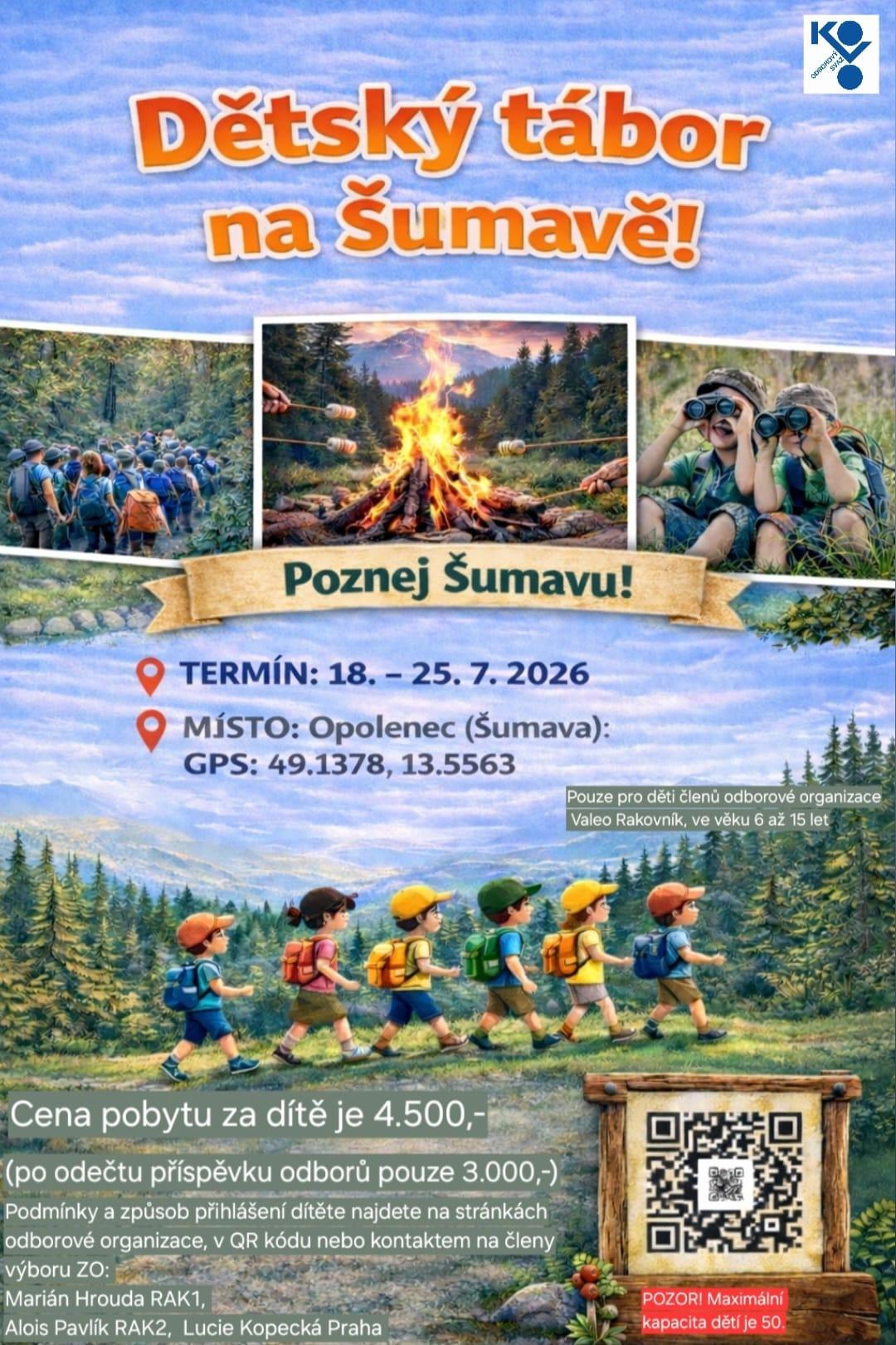 Jedním z benefitů je i dětský tábor OPOLENEC na Šumavě (ležící na břehu řeky Otavy mezi obcemi Annín a Radešov) konaný od 18-25 července 2026, kam může v případě zájmu každý člen naší odborové organizace přihlásit své dítě. Podrobnosti jsou uvedeny ve zveřejněné přihlášce a na plakátu. (také zde v sekci Výhody pro členy odborů Rakovník)